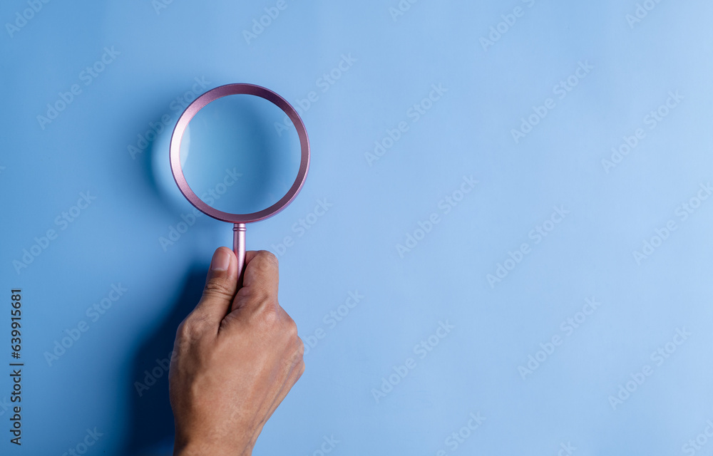 searching, securing, magnifier, icon, man, hand, blue, assurance, family, background. hold a magnifier to searching or find something at blue background. not has icon and symbolic isn't show.