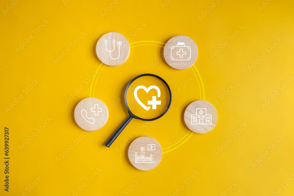 insurance, health, stethoscope, hospital, inpatient, family, life, assurance, supporting, health-care. middle of picture has magnifier to select insurance retirement plan, explore the best insurance.