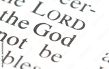 Word "God" on a page in a book, single word macro detail closeup, zoom shot, nobody God, deity, sacrum simple abstract concept, spirituality, religion and faith universal symbol, no people, Holy Bible