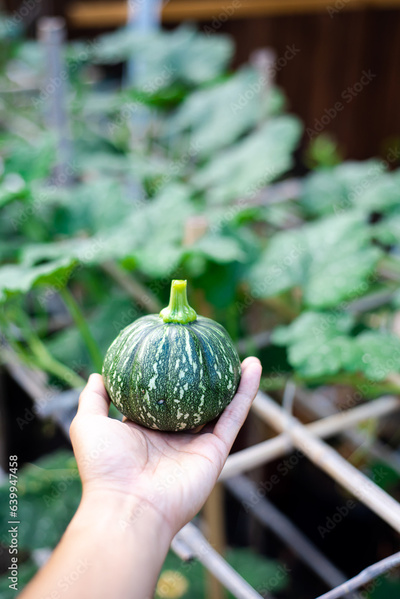 Backyard garden with Asian man hand holding fresh harvest eight ball squash, baby winter gourd faint vertical ridges, speckled light green striping, yellow mottling