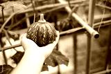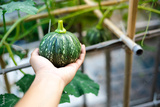 Fresh harvest baby winter squash in Asian man hand with hanging gourd on bamboo trellis background, eight ball gourd faint vertical ridges, speckled green striping, yellow mottling