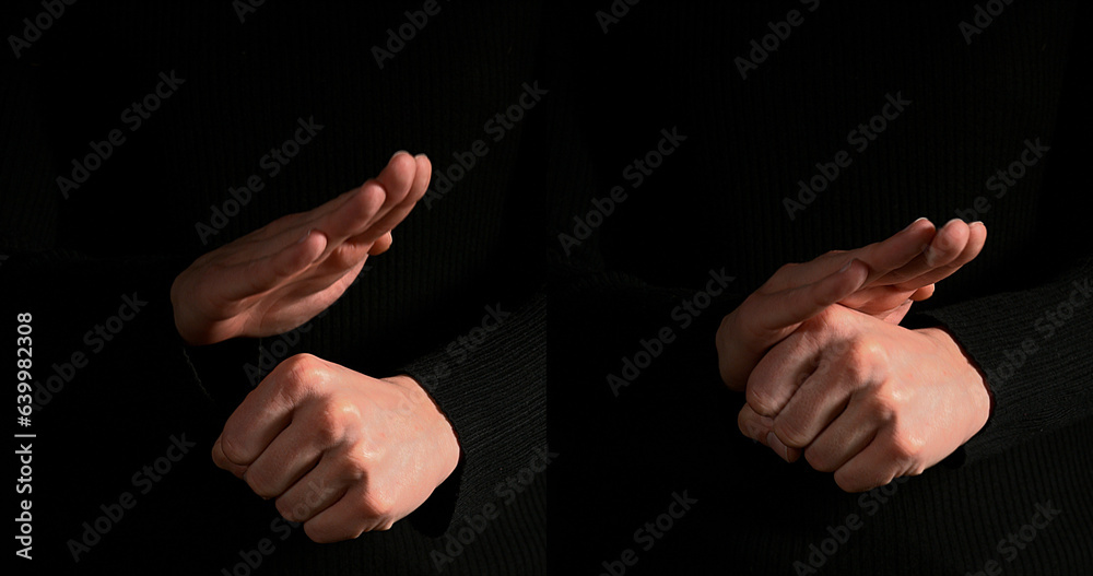 Hand of Woman making Sign against Black Background.