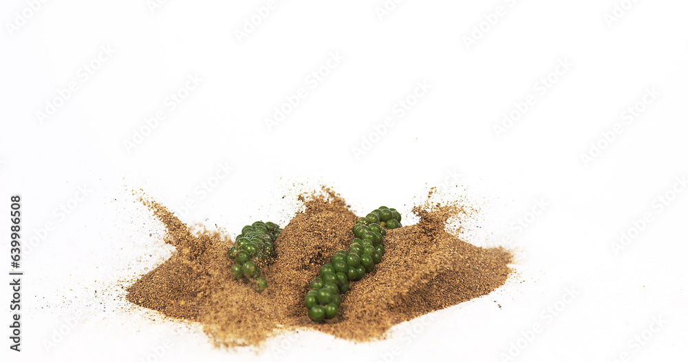 Fresh green pepper, piper nigrum, spice falling in pepper ground on white background