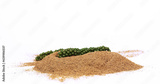 Fresh green pepper, piper nigrum, spice falling in pepper ground on white background