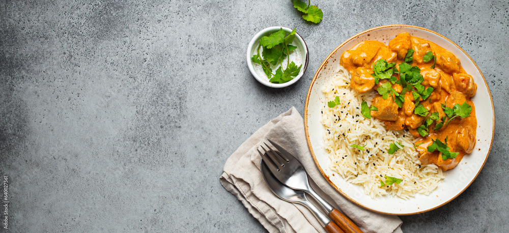Traditional Indian dish chicken curry with basmati rice and fresh cilantro on rustic white plate on gray concrete table background from above. Indian dinner meal
