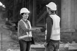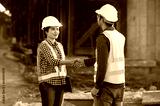 construction site Workers and engineers of various nationalities are discussing plans. Two construction workers working together while visiting expressway construction