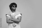 Handsome young smiling man in sunglasses on beige background, space for text