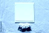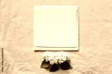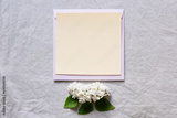 Happy birthday, mother's day, wedding composition. Blank greeting card, invitation and envelope mockup. Rectangular blank with delicate lilac flowers. Flat lay, top view.
