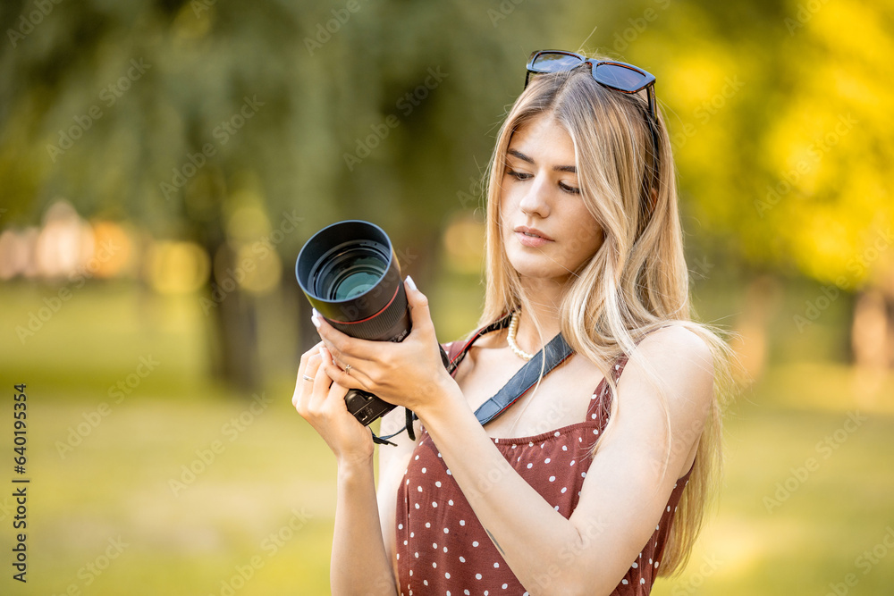 Woman is a professional photographer with dslr camera, outdoor and sunlight
