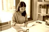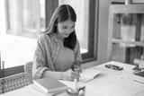 Self learning concept. Young woman student university Researching Book In Library. University Student