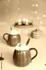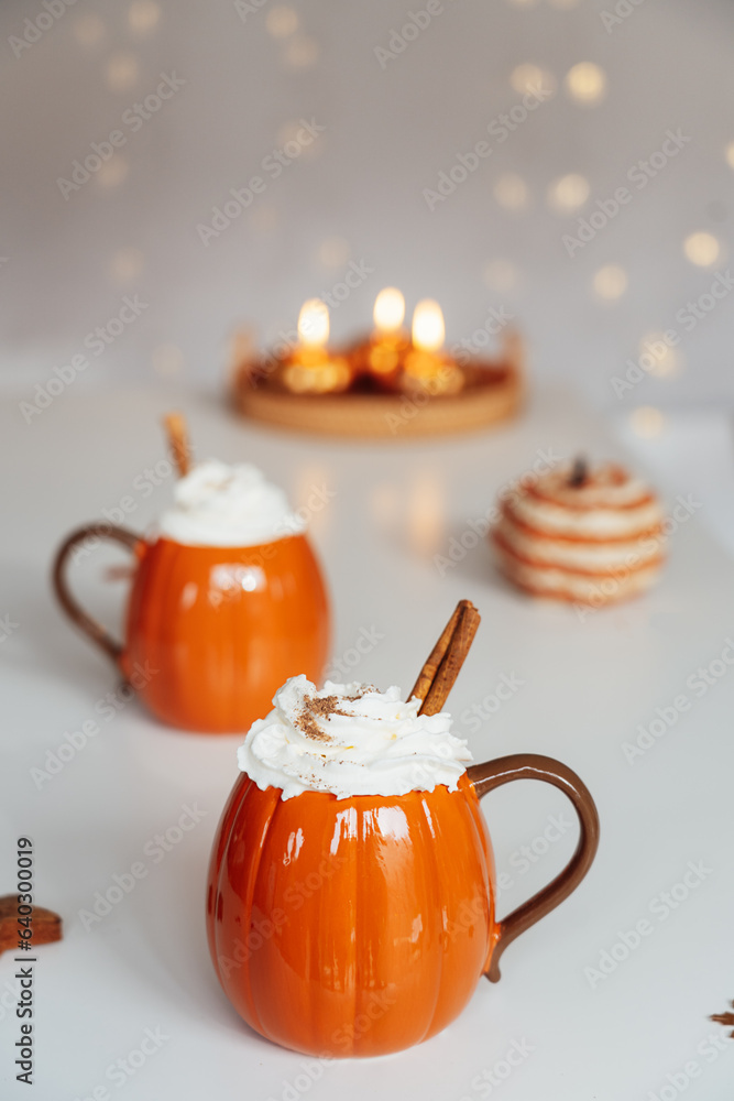 Pumpkin shaped cups of hot drink with whipped cream and cinnamon stick on white table with fall decor. Pumpkin latte with spices. Cozy autumn beverage for Thanksgiving or Halloween holidays at home.