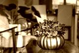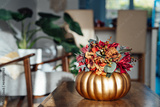 Autumn bouquet of bright artificial flowers in a golden pumpkin vase on the wooden coffee table with modern living room interior background. Hygge home fall decor for a cozy home atmosphere.