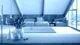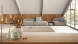 Wooden table, desk or shelf close up with ceramic and glass vases with dry plants, straws over blurred view of minimalist mansard living room, modern interior design concept