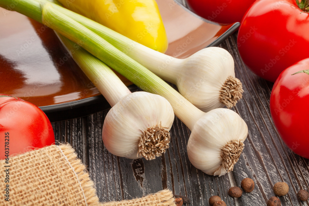 young garlic on wood background