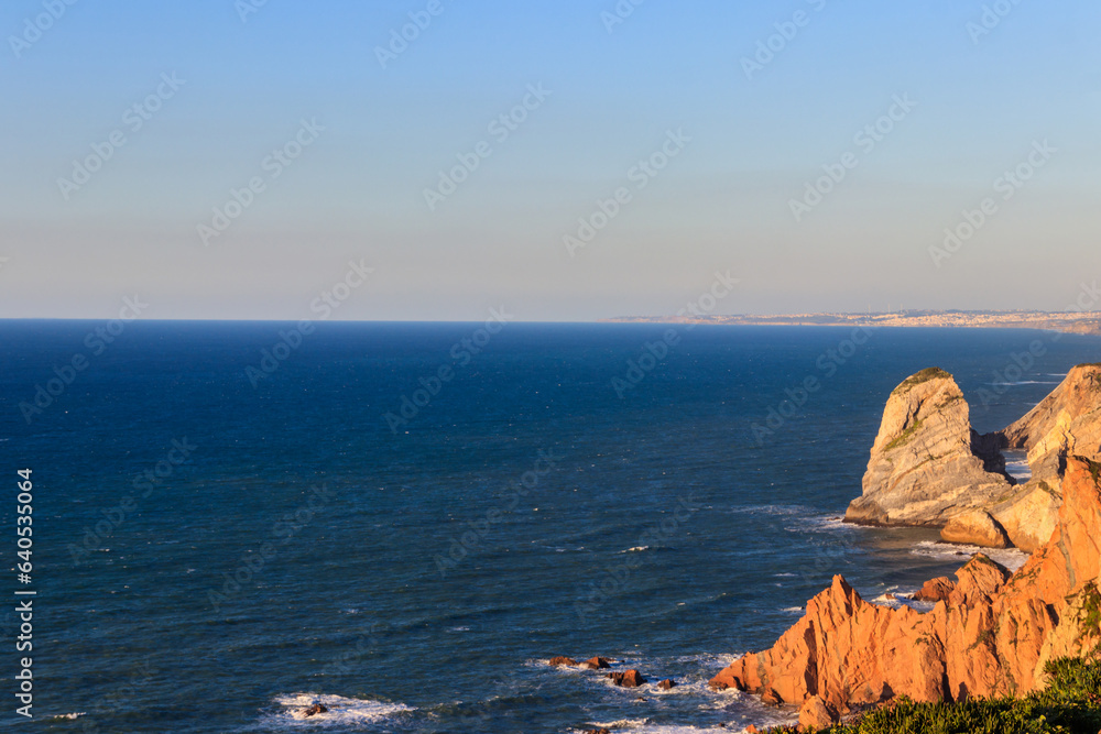 View of the Atlantic Ocean from Cabo da Roca. Cabo da Roca or Cape Roca is westernmost cape of mainland Portugal, continental Europe and the Eurasian land mass