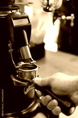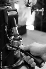 Freshly ground coffee from a modern professional coffee grinder falls into a double portafilter. The process of making espresso coffee in coffee shop.