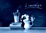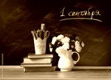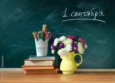 "1 September" text on russian language on school shalkboard. flowers, books, stationery supplies on table. Back to school, beginning of school year, education. start of autumn season. Knowledge Day
