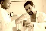 Curiosity African Asian primary school boy student wearing lab coats happy studying with chemical teacher analyzing substance liquid test in laboratory room, lifestyle learning education science class