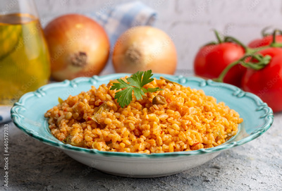 Traditional turkish bulgur pilaf with tomato sause in plate (Turkish name; meyhane pilavi)