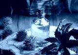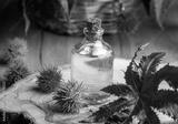 Castor oil bottle with castor fruits, seeds and leaf. Ricinus Communis plant oil.