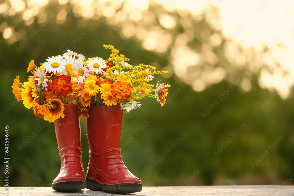 Red rubber boots with flowers bouquet in garden, natural abstract background. symbol of summer end, autumn season beginning. rustic composition with seasonal flowers. copy space