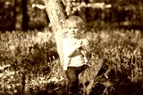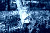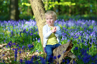 Lovely toddler girl plays in beautiful forest full of bluebells