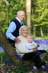 Grandparents with granddaughter enjoying blooming forest