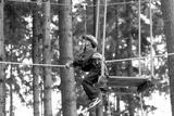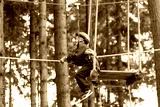 Happy school boy climbing in adventure park