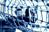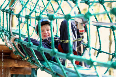 Happy school boy climbing in adventure park