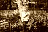 Lovely toddler girl plays in beautiful forest full of bluebells