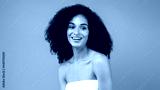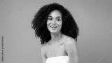 Natural beauty. Happy young latin lady with curly hair enjoying selfcare routine, posing over brown background, panorama
