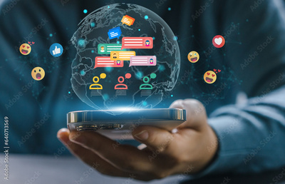 Concept of social media communication and digital online, people use smartphone playing with icon online social media, online marketing, technology, chat, post, like, follow at phone screen