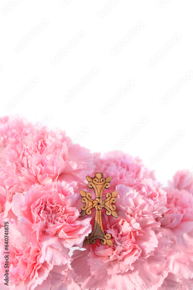 Wooden christian cross with pink carnations flowers close up on abstract white background. Symbol of the death and resurrection of Jesus Christ, Faith of God, Hope, Love. Religious church holiday