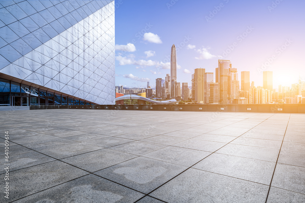 Empty square floors and city skyline with modern buildings scenery in Shenzhen, Guangdong Province, China.
