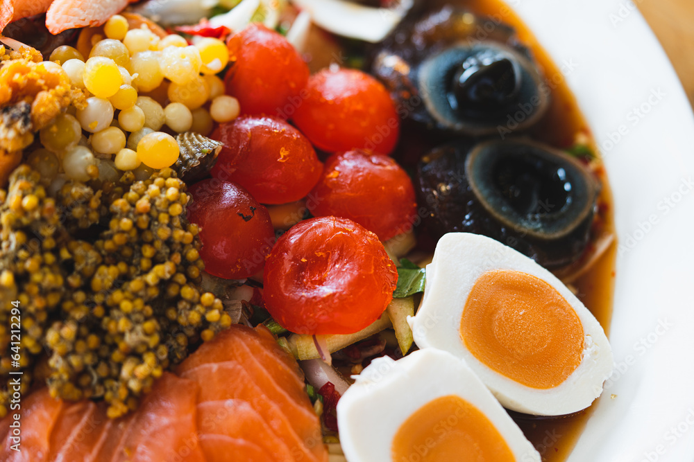 Spicy Thai food, Yum, Spicy egg mixed salad, Collection set of spicy salad. Thai cuisine is delicious food popular. Many variety of various Thai menu Asian food