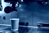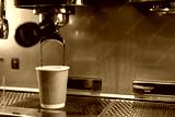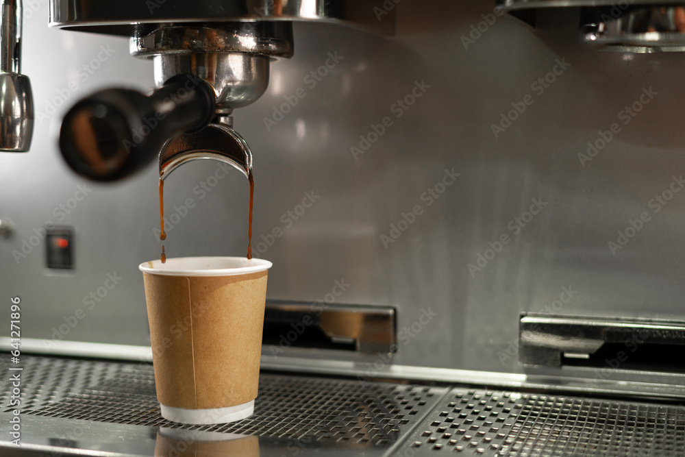 Coffee extraction in paper cup from professional coffee machine with portafilter