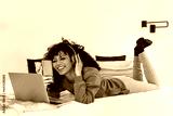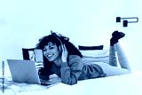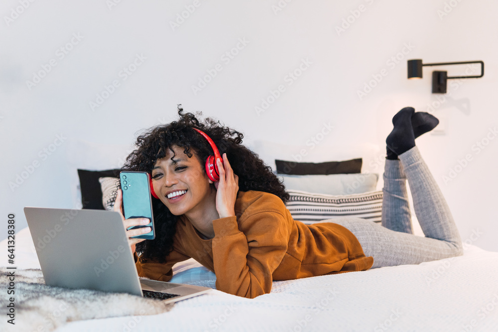 Female African American college student using phone and headphones listening to music lying on bed. Hispanic young woman relaxing.
