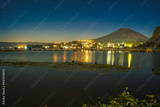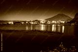 The evening atmosphere at Lake Batur, Kintamani, Bali, with the reflection of Mount Batur and the ambiance of the village along the lake's edge, illuminated by sparkling lights.