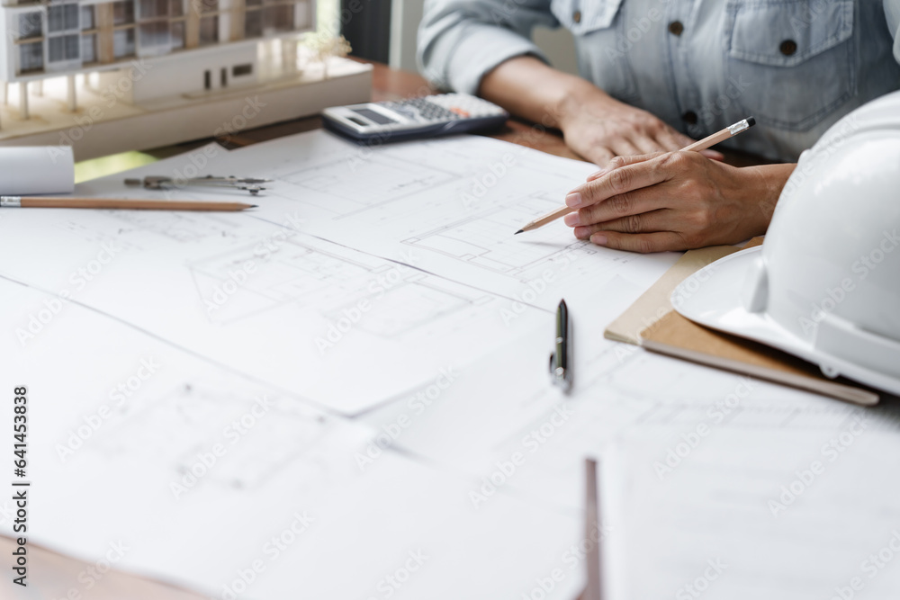 Engineer or interior Architects designer construction plans on blueprint