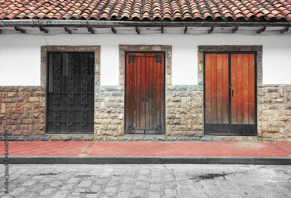 Street view of an old colonial building facade, Cuenca, Ecuador.