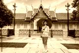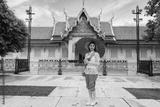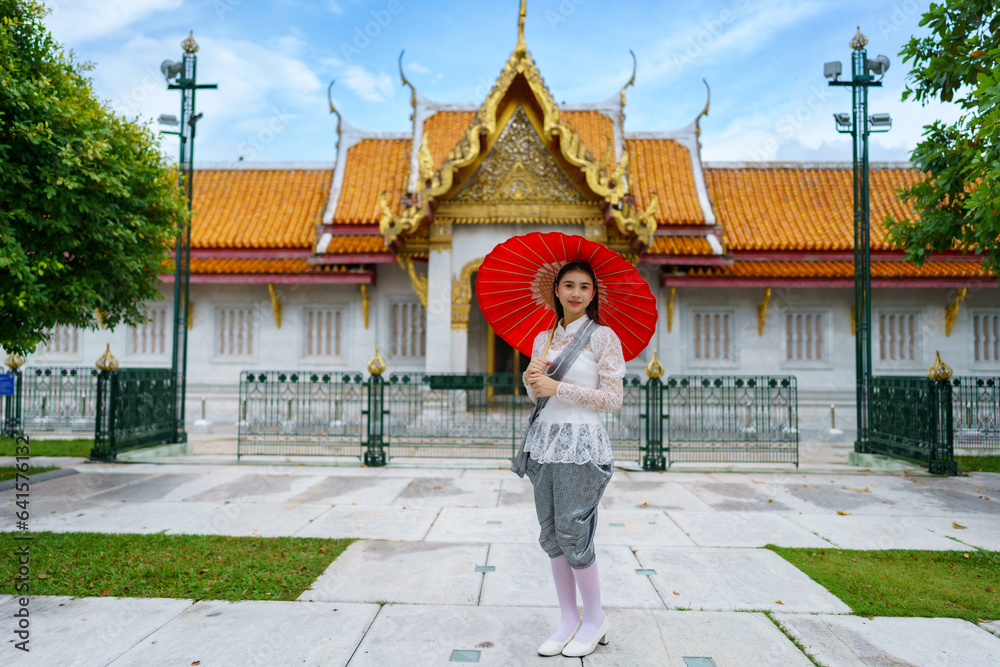 Portrait of beautiful young woman wearing Thai Rattanakosin national costume in a temple built according to Thai art in Thailand.