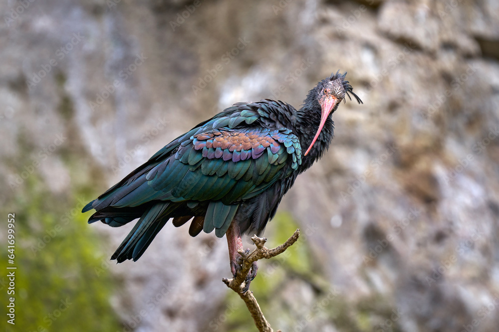Northern bald ibis, Geronticus eremita, black bird with red bill from Spain, Europe. Bald ibis sitting on the rock, near the nest. Animal in the habitat, nature wildlife. Bird on the rock in mountain