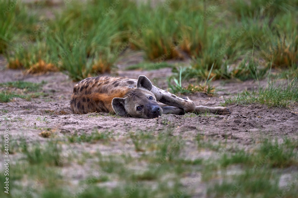 hyena lying on the savava, Okavango delta in Botswana. Africa wildlife. Rest relaxation in grass.