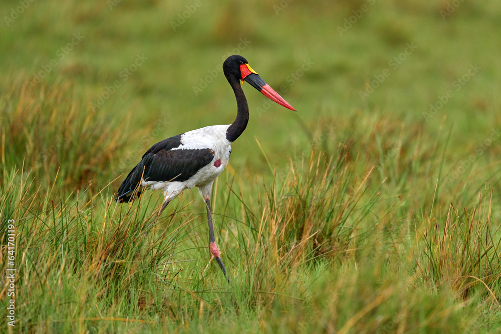 Okavango delta bird flight. Saddle-billed stork, or saddlebill, in nature habitat. Bird in the green grass during rain, Okavango delta, Botswana in Africa. Wildlife nature. Two big birds in fly.