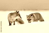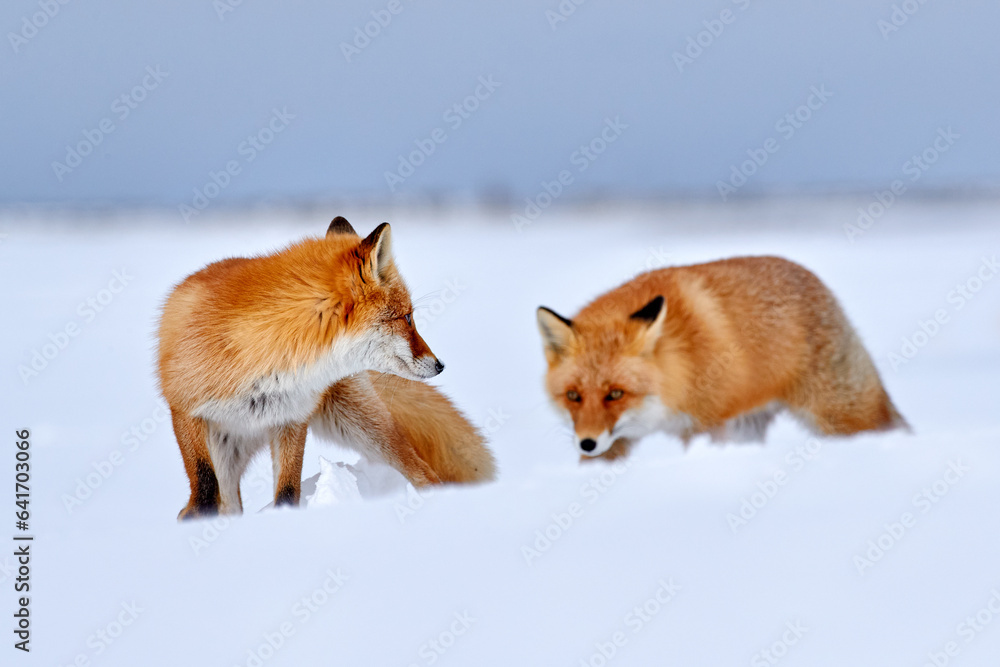 Red fox in white snow. Cold winter with two orange furry fox, Czech Republic, Europe. Beautiful orange coat animal in nature. Detail close-up portrait of nice mammal.