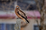 Bird, urban wildlife. Black kite, Milvus migrans, sitting on the tree during winter in Japan. Forest in background, wildlife from Asia.