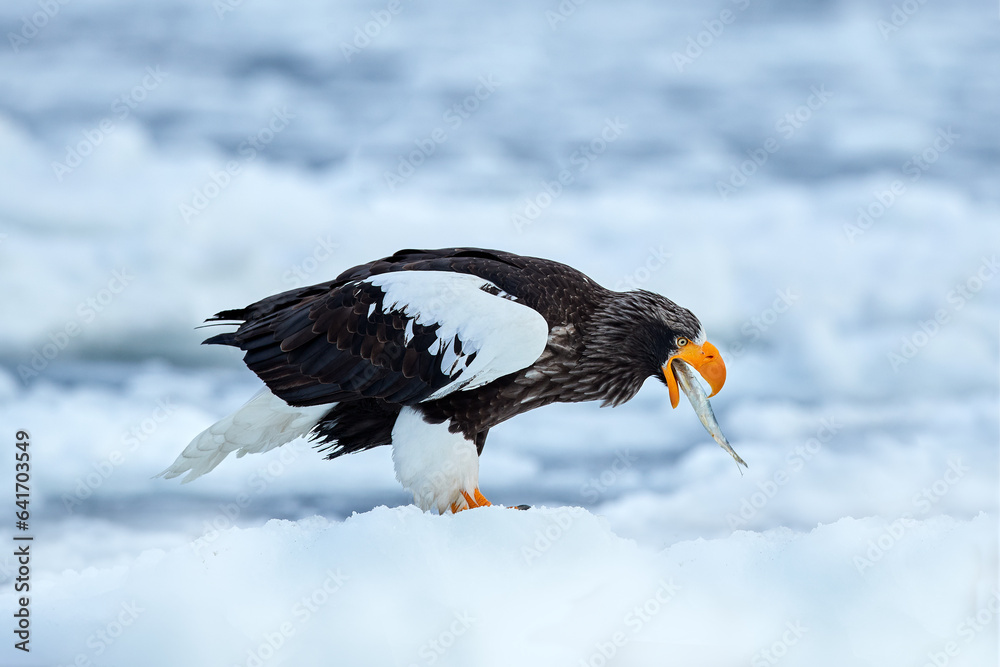 Japan winter wildlife. Sea bird on the ice. Steller's sea eagle, Haliaeetus pelagicus, bird with white snow, Hokkaido, Japan. Wildlife action behaviour scene from nature. Eagle sitting on the ice lake