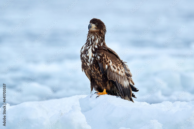 Japan winter wildlife. Sea bird on the ice. Steller's sea eagle, Haliaeetus pelagicus, bird with white snow, Hokkaido, Japan. Wildlife action behaviour scene from nature. Eagle sitting on the ice lake