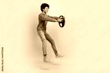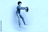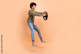 Full length photo of excited man professional driving simulation jump hold steering wheel fast speed auto school isolated on beige color background