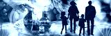 A collage showing flasks and a gloved hand holding a test tube, as well as silhouettes of parents with small children and a large clock face against the background of stylized DNA chains